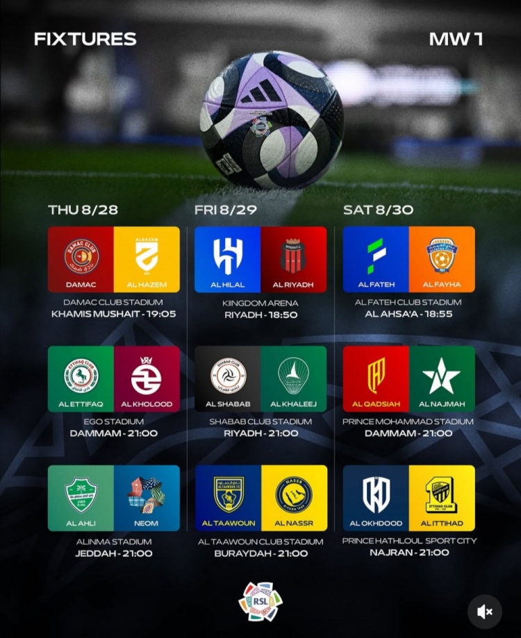 8月13日讯 新赛季沙特联将于本月底拉开帷幕。沙特联官方公布了2025/26赛季首轮9场比赛的比赛时间,具体如下(时间换算为北京时间,主队在前):